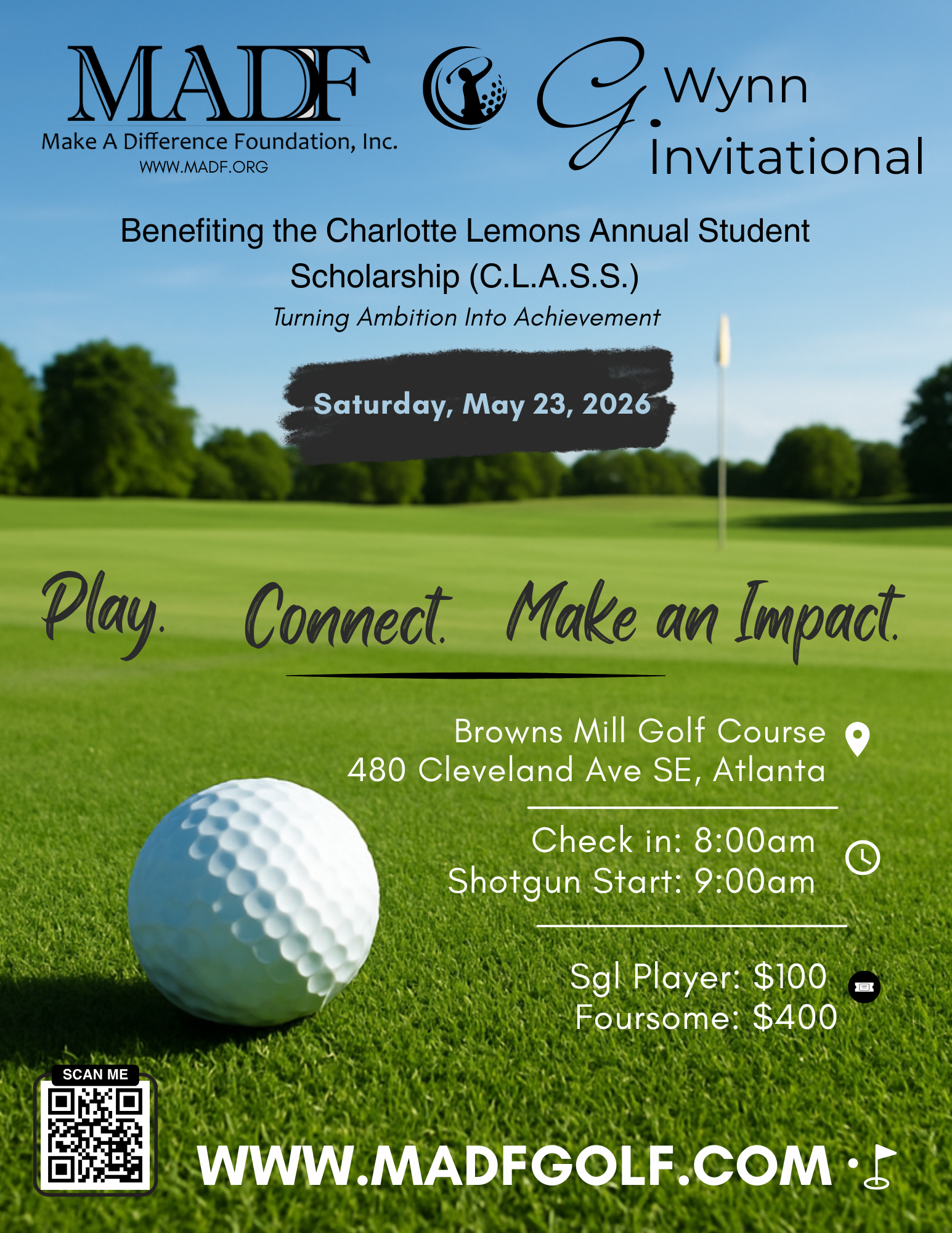 Help us turn "Ambition" into "Achievement" and join us for the 2026 MADF/G. Wynn Invitational! All net proceeds from this event benefit the Charlotte Lemons Annual Student Scholarship (C.L.A.S.S.) Award. C.L.A.S.S. is intended to give students in need of financial assistance the opportunity to further their education at a two or four-year college and/or technical institution. Each year we award up to $5,000 in scholarships to deserving students, empowering them to pursue higher education and achieve their dreams.